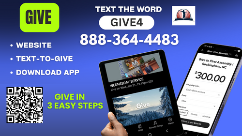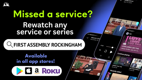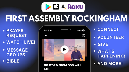 Check out our new website, app and tv channel! This app will help you stay connected with the day-to-day life of our church. Keep up with what's happening, watch a service live, give, volunteer, read the Bible or even start a prayer messaging group! You can find us in all the app stores. Just type in "First Assembly Rockingham" and download it today!